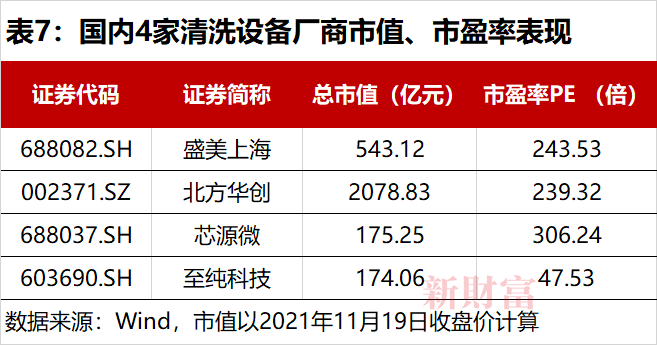 目前中国内地清洗设备领域主要有盛美上海、北方华创、芯源微、至纯科技4家主要厂商,且专注的领域有所差异。