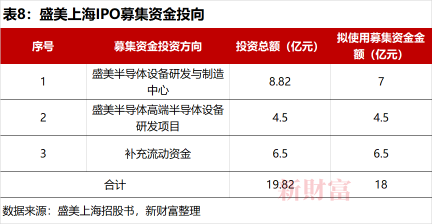 招股书显示,盛美上海IPO募资的6成用于设备研发,其中,盛美半导体设备研发与制造中心总投资超过8.8亿元,拟使用募资7亿元,将于2023年投入使用(表8)。