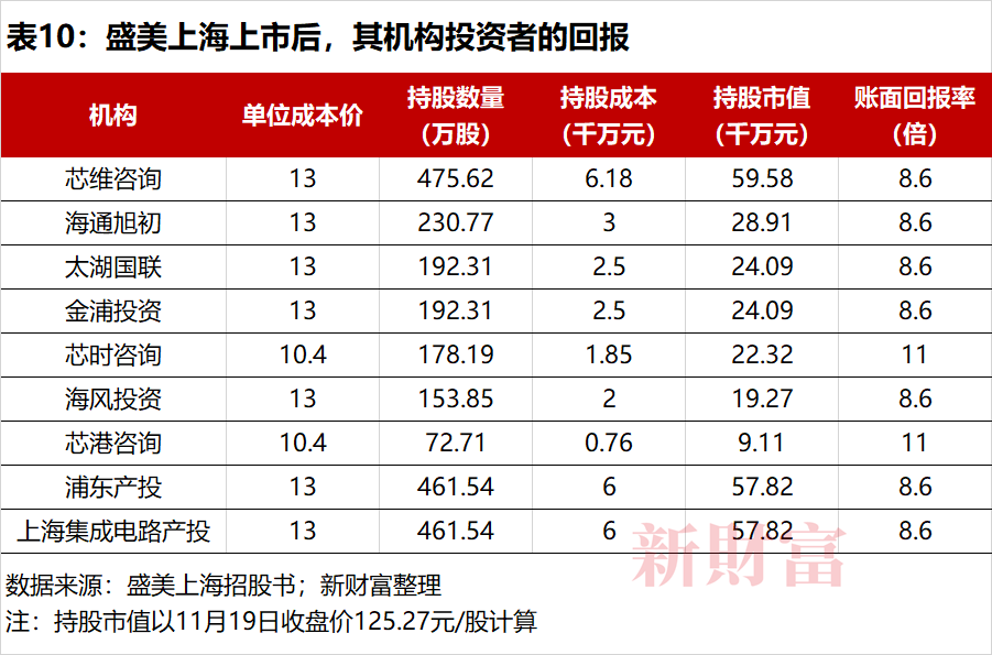 从账面财富来看,作为员工持股平台的芯时咨询和芯港咨询,回报率最高,达到了11倍。以11月19日收盘价计算,芯时咨询和芯港咨询的持股市值分别达到了2.23亿元和0.91亿元。芯时咨询由盛美上海37名核心技术人员和管理人员组成,他们人均持股市值达到602.7万元。芯港咨询则主要由48位盛美上海的核心业务人员组成,人均持股市值达到189.6万元。