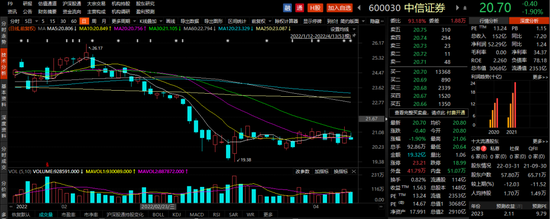 而从近期披露的2021年业绩表现来看,券商机构整体业绩平稳增长,总体为股价与业绩表现背离状况。其中,中信证券去年实现营收765.24亿元,同比增加40.71%;归母净利润约为231亿元,同比增逾55%。