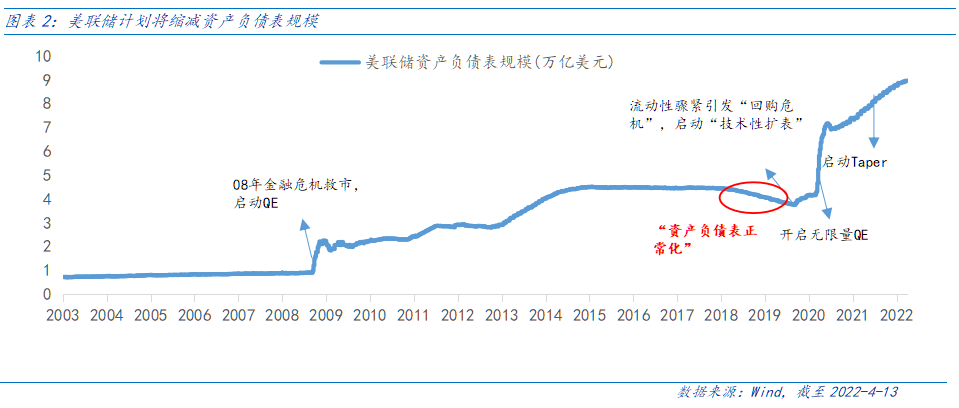 对比上一轮美联储缩表,无论是从加息到缩表的时间(2年 VS 2个月)、每月缩表规模(500亿美元 VS 950亿美元)、达到缩表上限的时间(1年 VS 3个月)来看,美联储“暗示”的本轮缩表路径都更为激进。但从历史实施经验来看,扩表容易缩表难。上一轮缩表自2017年10月开启,仅持续到2019年9月结束,之后便开始新一轮扩表。期间,美联储资产负债表从约4.47万亿美元降至约3.76万亿美元,降幅仅为16%。本轮“更加激进”的缩表能否“顺利进行”?有待进一步关注通胀发展及美联储政策动向。