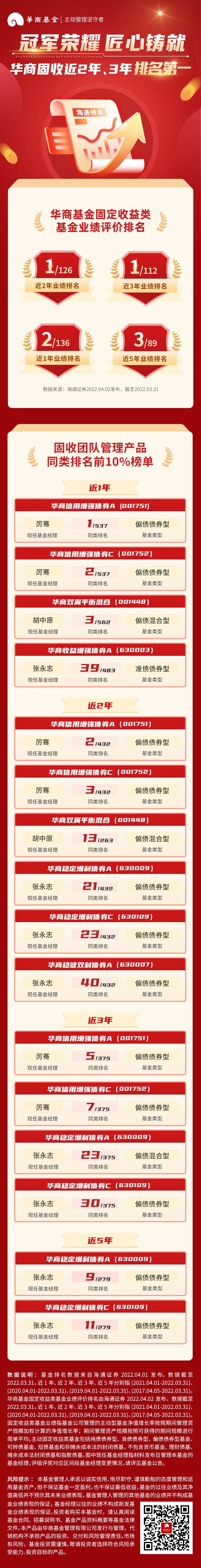 2022年4月,海通证券最新一期《基金公司权益及固定收益类资产业绩排行榜》发布。数据显示,截至2022年3月31日,华商基金旗下固定收益类基金近2年、近3年业绩评价均为同类第一,近1年、近5年业绩评价分别位列第二、第三。