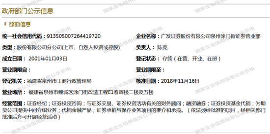 据企查查信息,广发证券泉州营业部成立于2001年,目前参保人数56名。营业部负责人陈亮,自2004年7月入职广发证券,此前曾任龙岩市龙岩大道营业部(简称:龙岩营业部)总经理;2018年11月,他接替苏晖任泉州营业部总经理。2019年1月,龙岩营业部负责人变更为温晓伟。