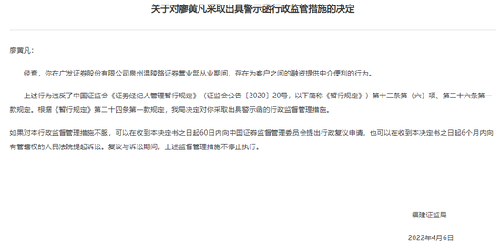 福建证监局指出,广发证券泉州营业部员工廖黄凡存在为客户之间的融资提供中介便利的行为,并对其出具监管警示函。