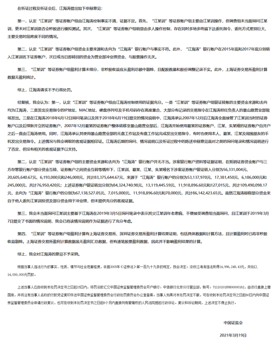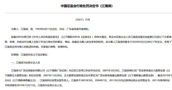 据证监会官网发布于2021年3月的〔2021〕15号行政处罚决定书,广发证券珠海景山路营业部原总经理江海涛,在职期间违规交易股票,证监会依法没收其违法所得1499.62万元,并罚款1400万元。