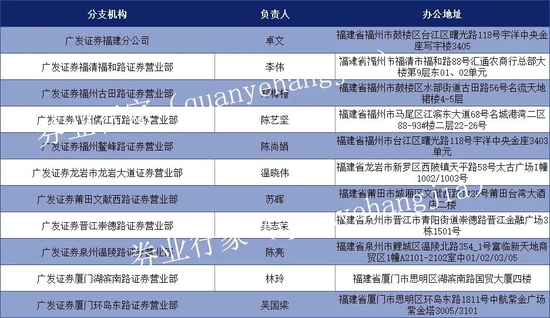 据广发证券2021年报,福建省内共有11家分支机构:福建分公司位于福州,10家营业部中,福州4家,厦门2家,泉州2家,龙岩和莆田各1家。