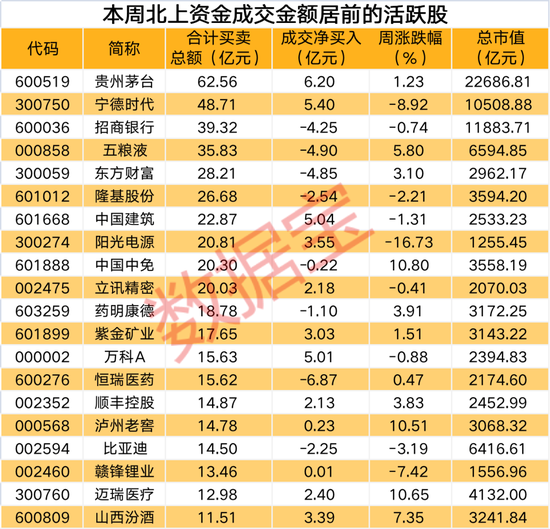 证券时报·数据宝统计显示,本周共有29股登上北上资金成交活跃榜,所属行业来看,电气设备、食品饮料、银行行业买卖总额超过50亿元。近期北上资金回流多只前期重仓的蓝筹股,贵州茅台、宁德时代、美的集团本月均获北上资金增持。