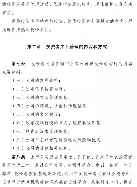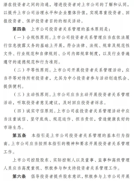 解读:成熟理性的投资者队伍是资本市场生态中重要的组成部分,也是构建上市公司投资者关系管理的良性循环的有机主体。《指引》倡导投资者坚持理性投资、价值投资和长期投资的理念,形成理性成熟的投资文化。