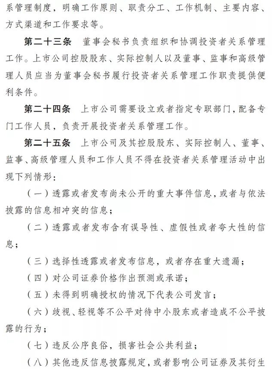 解读:《指引》规定了上市公司投资者关系管理制度应当包括的内容,明确投资者关系管理的责任主体、部门设置及主要职责、人员要求、培训要求及存档要求。明确上市公司投资者关系管理工作的执行问题,提升了规则的可操作性。