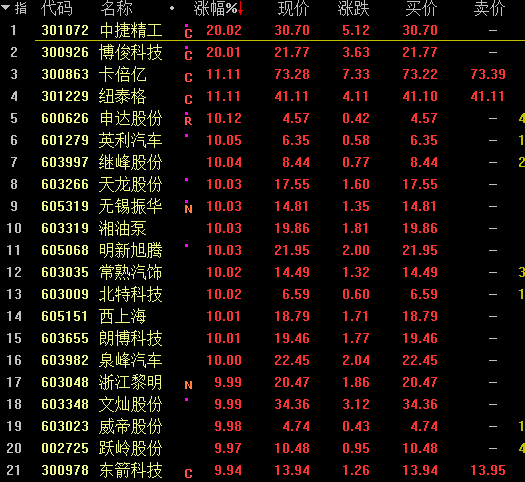 汽车板块指数高开高走,涨近2%,这已是该板块连续第3个交易日上涨,中捷精工、博俊科技20%涨停,英利汽车、常熟汽饰、泉峰汽车等逾20股涨停或涨超10%;汽车电子板块大涨逾2%,同样连续3日上涨,申达股份、威帝股份等近10股涨停或涨超10%;汽车芯片、无人驾驶、胎压监测等相关板块均逆势上扬,天龙股份、华锋股份等强势涨停。