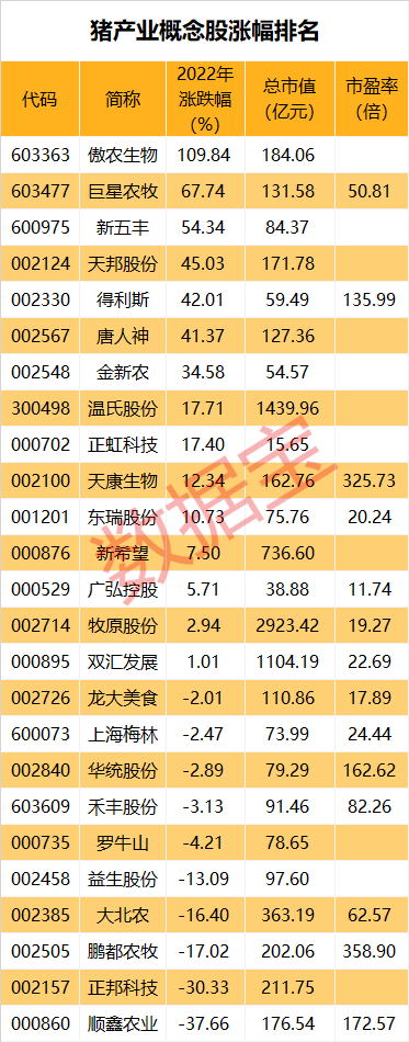 证券时报·数据宝统计,今年内,猪产业指数涨幅近12%,傲农生物股价年内翻番,巨星农牧、新五丰等个股年内上涨超过50%,行业龙头牧原股份年内小幅上涨近3%。