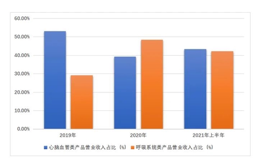 随着2020年初疫情爆发,以岭药业包含连花清瘟胶囊/颗粒、连花清咳片在内的呼吸系统类产品收入出现大幅增长,从2019年的17.03亿元增至2020年的42.56亿元,同比增幅达到149.89%。该产品的收入占比也由2019年的29.24%上升至2020年的48.46%,超过该公司当年度心脑血管类产品的收入占比。
