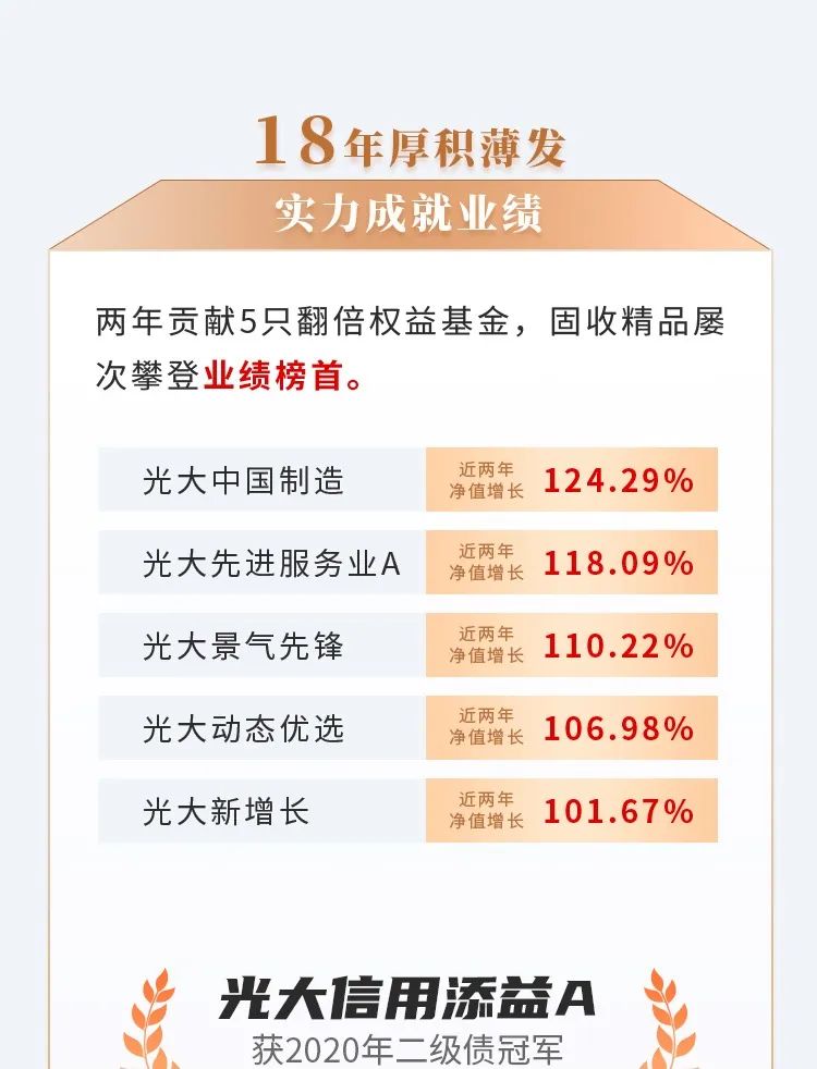 过去两年光大保德信权益投资5只翻倍基,时间截至2021.12.31,具体包含光大中国制造(124.29%)、光大先进服务业A(118.09%)、光大景气先锋(110.22%)、光大动态优选(106.98%)、光大新增长(101.67%),上述区间收益率已经托管行复核。