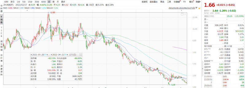 而美股上市以来,知乎股价只经历了短暂爬坡,在2021年6月涨至13.85美元的高位,随后便开始一路震荡下跌,今年3月甚至跌至1.39美元,区间跌幅近90%。截至发稿前,知乎美股报1.66美元,总市值10.83亿美元,相较于上市首日市值蒸发超36亿美元。