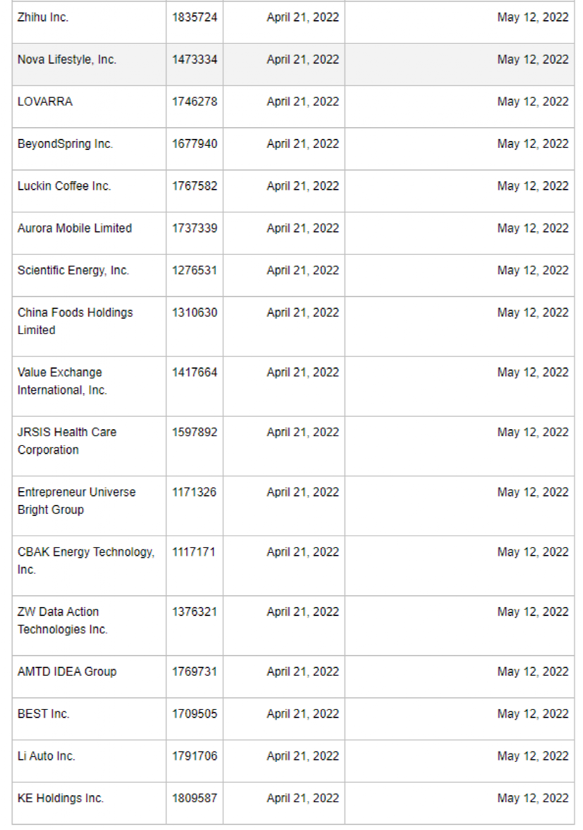 具体名单为:知乎、诺华家具、LOVARRA、万春医药、瑞幸咖啡、极光移动、Scientific Energy、中国食品、Value Exchange International、泽尔西西医疗集团、Entrepreneur Universe Bright Group、中比能源、中网载线、尚乘国际、百世集团、理想汽车和贝壳。SEC表示,这17家公司提交申辩的截止时间为当地时间5月12日。而富途控股、Nocera、爱奇艺、百度和凯信远达医药五家中概股公司已从“预摘牌名单”进入“确定摘牌名单”。