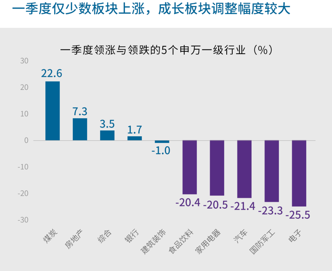 资料来源:万得,申万一级行业,共29个,上图展示了表现领先和落后的各5个行业,数据区间2022.01.01-2022.03.31。