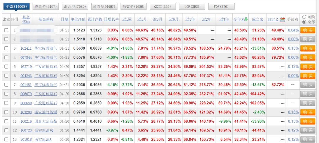 我看了看今年到目前为止的场外基金排行榜,排除巨额赎回的基金,排名靠前的全是QDII油气类基金,不过吧,现在还有QDII油气类基金限额或是暂停申购。