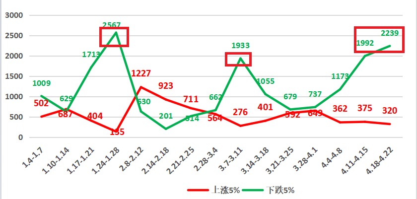 一是如下图所示,本周下跌家数超过5%的个股家数2239家——离前两次1月底数据2567家和3月中1933家较近,小级别的“冰点”可能引发一些抵抗。这时候技术面与基本面可以“共振”的一些个股机会相对较好。