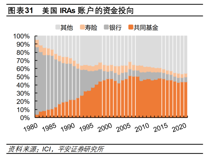 美国的个人退休账户机制跟我们的有些不一样,投资范围限制较少,但主要还是配置在共同基金(简单理解成场外公募)、银行储蓄存款、年金保险及其他财产(包括股票、债券、ETF等)。