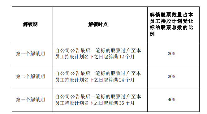 本员工持股计划持有的标的股票分三期解锁,解锁时点分别为自公司公告最后一笔标的股票过户至本员工持股计划名下之日起满12个月、24个月、36个月,每期解锁的标的股票比例分别为30%、30%、40%,具体如下: