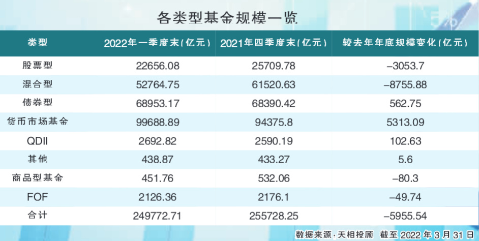 天相投顾数据显示,截至3月底,9000多只基金(统计样本为已披露2022年一季报的9103只基金及未披露2022年一季报的420只基金)合计规模达24.98万亿元,较去年12月底减少近6000亿元。