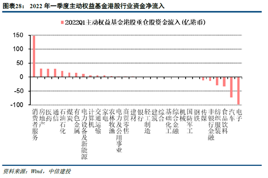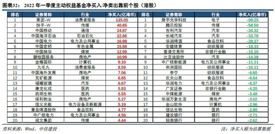 2022年一季度公募基金向港股消费者服务行业净流入接近150亿港币(其中美团约+135亿港币)。房地产、医药、通信行业的资金流入均为30亿港币左右。从电子行业净流出接近100亿港币(主要为舜宇光学科技)。从汽车行业净流出超过70亿港币(主要为吉利汽车、长城汽车)。配置比例较高的行业来看,电力公用、汽车、纺织服装、食品饮料、非银行金融、电子行业的配置比例和超配比例下滑较多,消费者服务、医药、房地产行业的配置比例和超配比例提升较明显。传媒行业整体配置比例和超配比例变动不大,但内部卖出腾讯较多、买入快手较多。易方达和中庚基金跃升成为持有美团较多的机构,兴证全球基金仍是持有快手最多的机构。