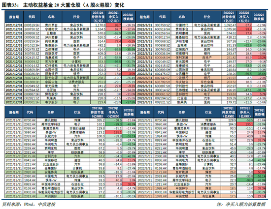●行业配置:关注养猪纯碱黄金板块从公募资金行业流向来看,有接近300亿资金流向新能源行业,其中电源设备接近150亿,动力电池接近100亿。医药、农林牧渔(主要是养猪板块)、基础化工(主要是锂电化学品和纯碱板块)、有色金属(主要是贵金属板块)也均超过150亿。●港股市场:“抄底”美团快手港股消费者服务行业净流入接近150亿港币(其中美团约+135亿港币)。房地产、医药、通信行业均净流入30亿港币左右。从电子行业净流出接近100亿港币(主要为舜宇光学科技)。从汽车行业净流出超过70亿港币(主要为吉利汽车、长城汽车)。传媒行业整体配置比例和超配比例变动不大,但内部卖出腾讯较多、买入快手较多。易方达和中庚基金跃升成为持有美团较多的机构,兴证全球基金仍是持有快手最多的机构。