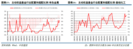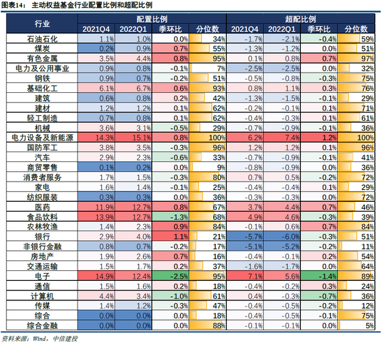 前四大行业:新能源和医药增配,食品饮料和电子减配。2022年一季度,主动权益基金配置比例和超配比例最高的行业为新能源、医药、食品饮料、电子,配置比例分别达到15.1%、12.7%、12.7%、12.4%,环比变化分别+0.8pct、+0.8pct、-1.3pct、-2.5pct;超配比例分别7.4%、4.6%、4.4%、5.6%,环比变化分别为+1.2pct、+0.7pct、-0.3pct、-1.4pct。除此之外,主动权益基金在2022年一季度增配较多的板块还有上游周期行业以及银行地产等稳增长方向。煤炭、有色金属、基础化工行业配置比例环比提升0.7pct左右,银行和地产行业配置比例分别环比提升1.1pct和0.7pct。其中有色金属行业超配比例也提升了0.7pct,说明公募基金主动超配的意图更强,其余行业超配比例提升幅度均较绝对配比提升幅度略小,银行超配比例甚至环比下降0.3pct。截至2022年一季度,有色金属、基础化工、新能源、国防军工、电子行业的配置比例,以及有色金属、新能源、国防军工、电子行业的超配比例,处于历史分位数85%上方。
