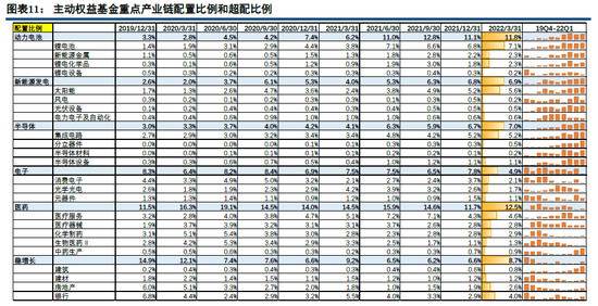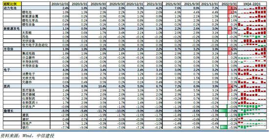 1)动力电池:绝对配比和超配比例均提升,锂电化学品提升明显,锂电池也有所提升。上游涨价压力下一季度新能源整车销售和电池出货量仍然亮眼,但需要注意成本端压力和疫情冲击供应链的不利影响。2)新能源发电:绝对配比和超配比例小幅提升,光伏增配,风电减配。光伏装机量和排产情况向好,产能供给情况偏紧,产业链价格预计仍有支撑。3)半导体:产业链配比提升(主要是分立器件和材料),各环节仍均有所增配。半导体下游需求结构分化,产能依旧偏紧,设备出货放缓,硅片供不应求。4)电子:绝对配比和超配比例均下降较多,消费电子和光学光电减仓明显。需求仍处下行周期,叠加疫情扰动。5)医药:绝对配比和超配比例略有回升,医疗服务、化学药、生物药、中药均有所回暖。6)稳增长:绝对配比明显提升,超配比例小幅下滑。当前政策意图明显但行业基本面数据仍待改善。