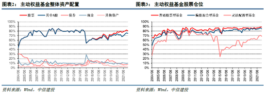 主动权益基金股票仓位回落,偏股混合型和灵活配置型基金仓位下降明显。整体来看,主动权益基金(普通股票型、偏股混合型、灵活配置型,全文同)股票仓位达到80.6%,环比下降1.6pct,处于2004年以来77%的历史分位水平。普通股票型、偏股混合型、灵活配置型基金股票仓位分别达到88.5%、85.0%、68.6%,分别环比下降0.2pct、1.5pct、1.2pct,分别处于2004年以来99%、94%、62%的历史分位水平。