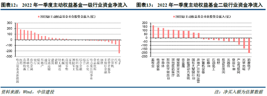 从公募资金行业流向来看,2022年一季度有接近300亿资金流向新能源行业,其中电源设备接近150亿,动力电池接近100亿。医药、农林牧渔(主要是养猪板块)、基础化工(主要是锂电化学品和纯碱板块)、有色金属(主要是贵金属板块)也均超过150亿。电子行业资金净流出约240亿,其中半导体方向净流入约130亿,消费电子净流出约200亿,光学光电净流出约140亿