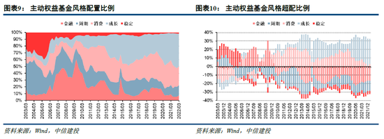 消费风格主动增配的比例较高,成长风格减仓明显,但无论从绝对还是相对比例来看成长仍然占据主导地位。金融、周期和稳定风格的配比提升幅度,均高于超配比例变化幅度,也印证了机构的谨慎态度。