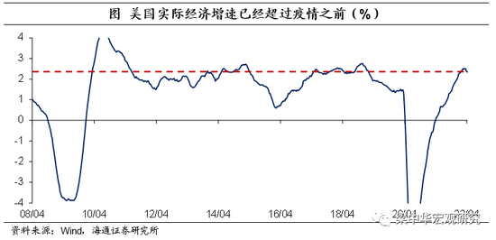 但和欧洲不同的是,美国经济增长还比较强劲。剔除基数影响后,截至去年4季度,美国名义GDP增速已经超过疫情之前;截至今年1季度,美国实际GDP增速也已经超过疫情之前。这主要是因为,美国在新冠期间重在刺激需求端,美国居民和企业资产负债表不受损反受益,居民收入高增长,需求较为强劲。所以从需求端来看,美国是全球通胀的主要输出者。