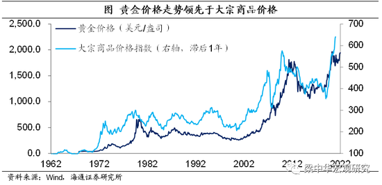 黄金是纸币的天然竞争对手,所以黄金价格的涨跌是反映纸币是否超发的重要标志。在纸币超发阶段,黄金价格会大幅上涨。随着超发的货币流入实体,又慢慢的推升通胀水平。所以我们发现过去几十年,黄金价格的变化是领先于大宗商品的,领先的时间大概是一年左右。