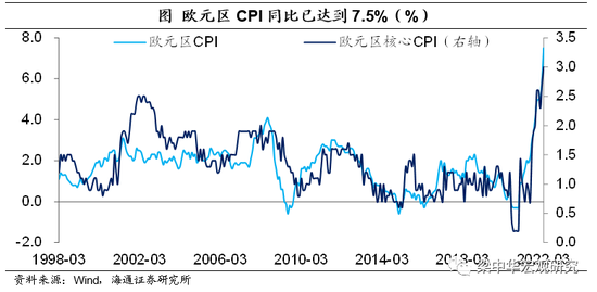 当前欧洲已经陷入到滞胀的困境。3月份欧洲PPI同比已经达到31.1%,欧元区CPI同比达到7.5%。剔除能源、食品的价格上涨后,欧元区核心CPI同比也已经达到3%。可以说,欧洲的各项通胀指标都已经达到了90年代有数据以来的最高水平。