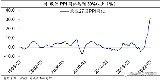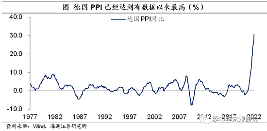 因为欧元区的通胀数据公布的时间段较短,如果我们要看更长周期的欧洲通胀历史,可以参考德国的数据。当前德国PPI同比达到30%以上,已经创下了70年代有数据以来最高水平。德国CPI同比达到7.3%,比70年代滞胀时期还要高,甚至已经在追赶一战、二战时的通胀水平。