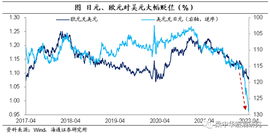 美元已经突破101,大概率还会维持上行。美国经济增长偏强,货币政策收紧,名义和实际利率抬升,是美元指数的主要推动力量。而且汇率是个相对的概念,美元指数衡量了美国相比其它经济体基本面的相对强弱变化,当前欧洲陷入了滞胀,日本在滞胀边缘,其货币政策都掣肘较大,所以这种相对变化也有助于支撑美元。相比之下,由于日本央行一直比较“鸽派”,日本经济也偏弱,截至4月22日,日元从3月以来已经对美元贬值了10.6%,而在此期间欧元兑美元只贬值了2.9%,美元指数只升值了3.8%。
