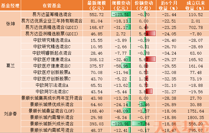 数据显示,从一些明星基金经理所管理的产品份额来看,申赎规模变化并不大,还有不少产品被基金投资者“越跌越买”,规模的缩水主要还是净值下跌导致的。