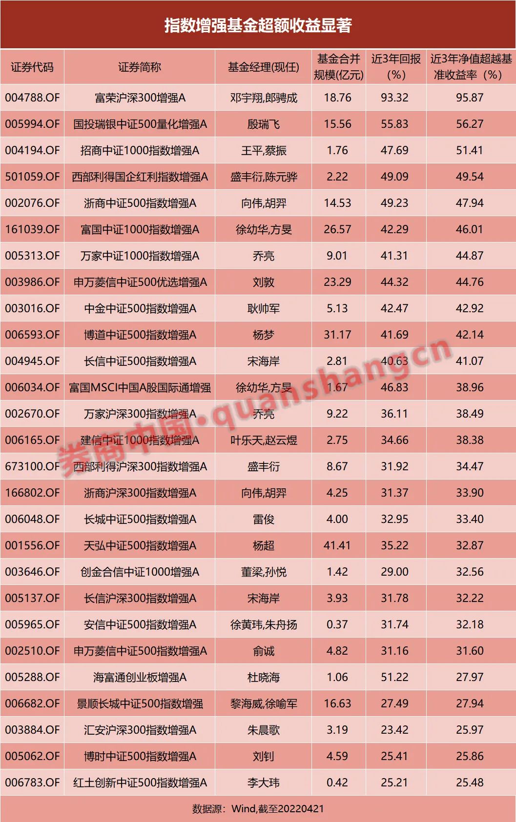 拉长周期看,Wind数据显示,77%的指数增强基金产品成立以来净值回报跑赢产品对标的基准。其中申万菱信沪深300指数增强A、易方达上证50增强A、国投瑞银中证500量化增强A等11只产品成立以来获得超过基准的收益(超额收益)超过1倍,跑输基准10%的指数增强基金数量仅有6只。