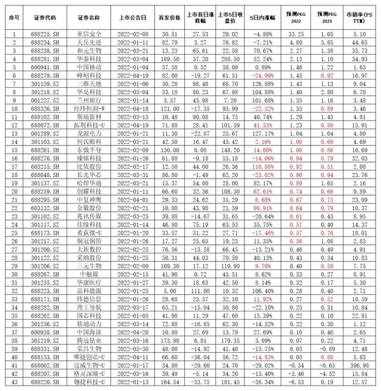上面抽样列举了2022年的新股(以能计算PEG比率为主,以0.5-1为较为合理估值,新股大部分成长性较高),其中43家新股中,2022年预测的PEG在合理范围的仅有13家,占比约30%,换言之,大概有7成的新股估值并不健康,甚至有些明显高估的新股如天岳先进(688234.SH)、和元生物(688238.SH)以及华秦科技(688281.SH),PEG高不说,市销率都在30倍以上,这些还是在近期大盘回调后的估值,显然在上市当天的估值更高。