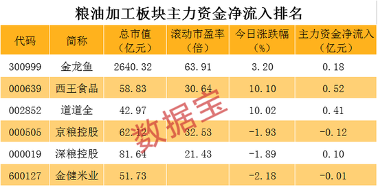 A股市场上粮油加工板块合计有6只个股,总市值接近3000亿元。其中,金龙鱼市值超过2600亿元。今天该板块6只个股有3只逆市上涨,西王食品、道道全两只个股涨停,金龙鱼涨逾3%,其他3只个股跌幅均在2%左右。从资金流向上看,西王食品吸金最多,主力资金净流入逾5100万元。