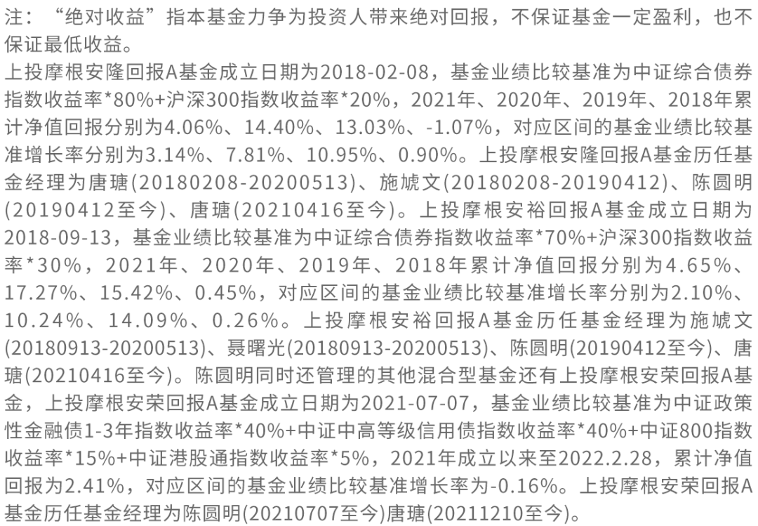 数据来源:基金业绩及基准数据来自上投摩根,基金业绩已经托管行复核,最大回撤数据来自万得,截至2022.2.28.上投摩根安隆回报A成立以来收益/业绩比较基准收益分别为32.84%/20.85%;上投摩根安裕回报A成立以来收益/业绩比较基准收益分别为41.99%/25.19%。上投摩根安隆回报基金成立日期为2018-02-08,上投摩根安裕回报基金成立日期为2018-09-13。陈圆明于2019.4.12起担任上投摩根安隆回报、安裕回报基金的基金经理,唐瑭于2021.04.16起担任上投摩根安隆回报、安裕回报基金的基金经理。基金的过往业绩及其净值高低并不预示其未来业绩表现,基金管理人管理的其他基金的业绩并不构成对基金业绩表现的保证。