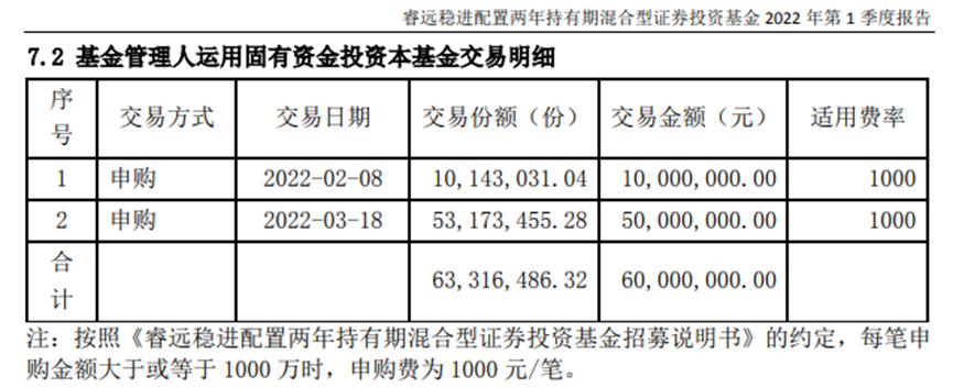3月份再度公告,睿远基金将于3月18日(含)起10个交易日内使用固有资金申购旗下公募基金,拟申购金额合计不低于1.5亿元,持有时间不少于5年。