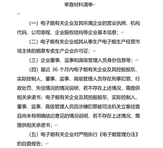 证券时报记者查阅发现,审查材料清单多达20项,既包括电子烟有关企业营业执照、烟草专卖生产企业许可证等信息,也包括董监高身份、有无行政处罚等信息,还包括原料采购、产品生产及海外销售订单等数据。