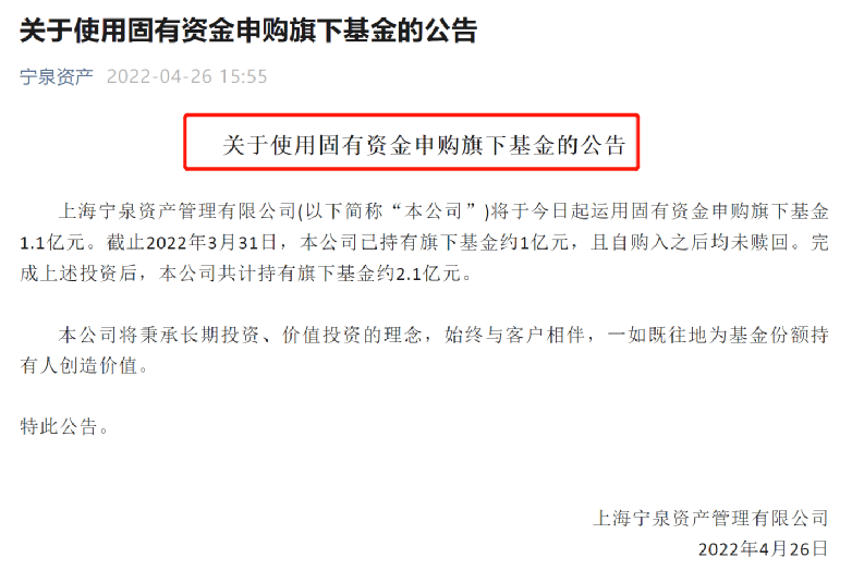 周二盘后,由资管圈大佬杨东创办的宁泉资产发布《关于使用固有资金申购旗下基金的公告》,公告称,宁泉资产将于今日(4月26日)起运用固有资金申购旗下基金1.1亿元。“截止2022年3月31日,本公司已持有旗下基金约1亿元,且自购入之后均未赎回。完成上述投资后,本公司共计持有旗下基金约2.1亿元。”