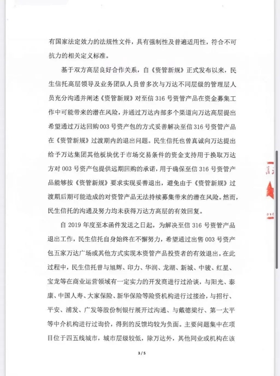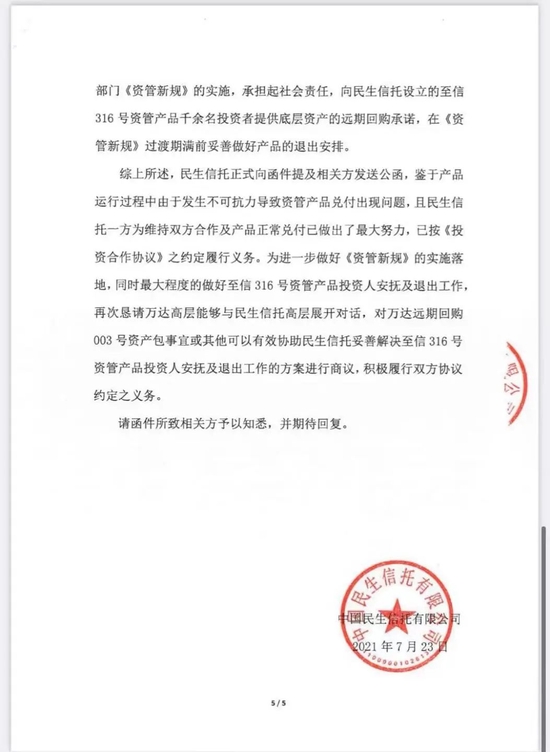 综上所述,民生信托正式向函件提及相关方发送公函,鉴于产品运行过程中由于发生不可抗力导致资管产品兑付出现问题,且民生信托一方为维持双方合作及产品正常兑付已做出了最大努力,已按《投资合作协议》之约定履行义务。为进一步做好《资管新规》的实施落地,同时最大程度的做好至信316号资管产品投资人安抚及退出工作,再次恳请万达高层能够与民生信托高层展开对话,对万达远期回购003号资产包事宜或其他可以有效协助民生信托妥善解决至信316号资管产品投资人安抚及退出工作的方案进行商议,积极履行双方协议约定之义务。