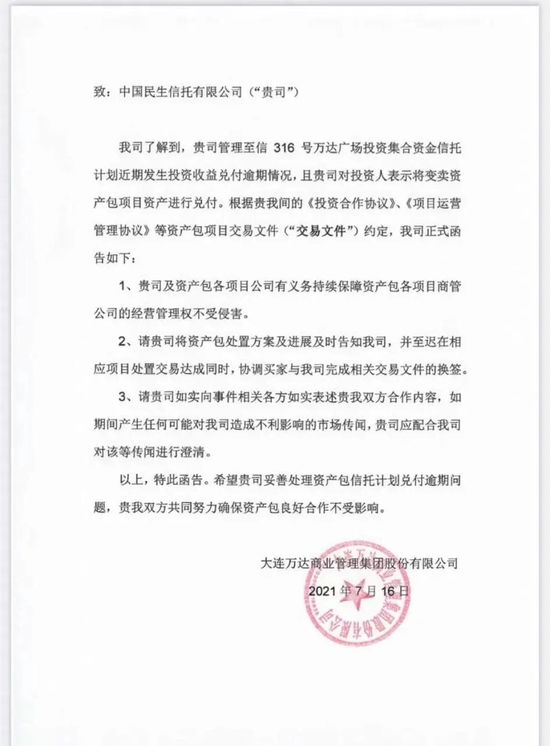 我司了解到,贵司管理至信316号万达广场投资集合资金信托计划近期发生投资收益兑付逾期情况,且贵司对投资人表示将变卖资产包项目资产进行兑付。根据贵我间的《投资合作协议》《项目运营管理协议》等资产包项目交易文件(“交易文件”)约定,我司正式函告如下: