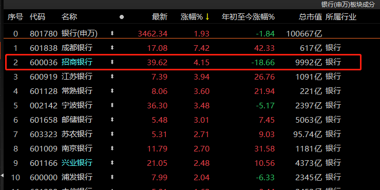 银行板块涨近2%,近期大跌的招商银行今日回暖,收涨4.15%报39.62元/股。
