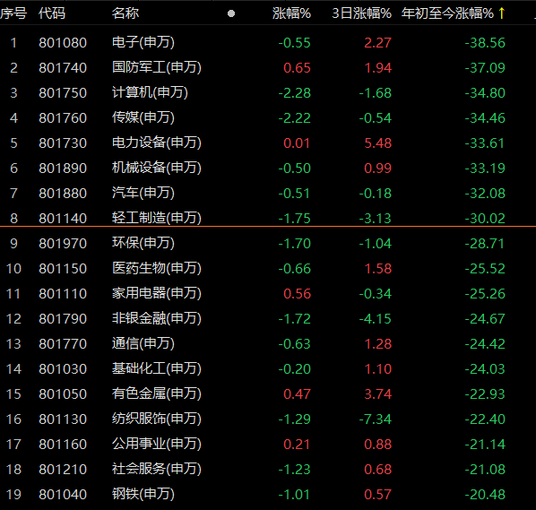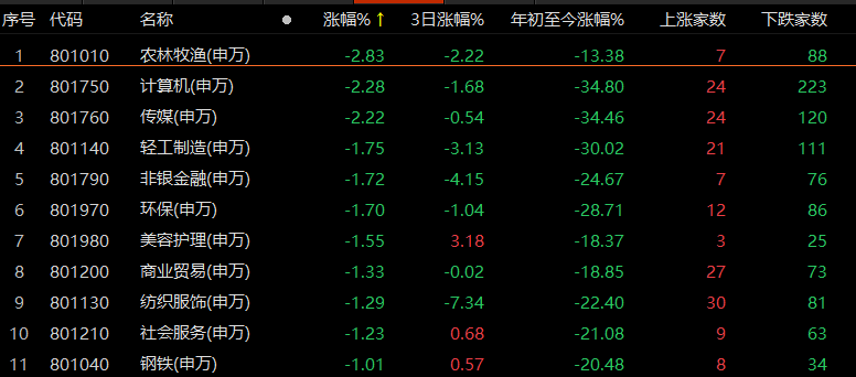 而农林牧渔板块跌近3%,计算机、传媒板块跌幅超过2%。