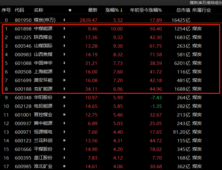 大幅震荡后的A股,今日明显“信心不足”。煤炭板块“扛起大旗”,年内累计近18%涨幅“一枝独秀”,其余板块年内出现不同程度的下跌,尤其是科技类板块持续大跌。“煤炭大哥”中国神华今日涨近8%,年内涨幅约39%,最新市值水涨船高至6201亿元。中煤能源涨停,年内累计涨幅超过50%。